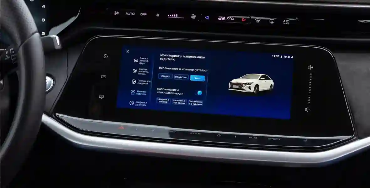 И коль скоро разговор зашёл об электронике, стоит упомянуть о ней в разрезе ездовых впечатлений: в работе ассистирующих систем китайского седана тоже хватает особенностей. Начнём с неприятных — к ним относится слишком навязчивый контроль за вниманием водителя. Буквально на каждое неосторожное движение глазами система реагирует истерическим пиканьем. Конечно, смотреть на ходу в телефон или рыться в бардачке нельзя. Но неприятного тона звуковой сигнал в момент, когда водитель скашивает взгляд на перекрёстке, чтобы удостовериться в отсутствии помех, — уже перебор. А самое неприятное: формально эту систему можно выключить, но… она тут же включается обратно!